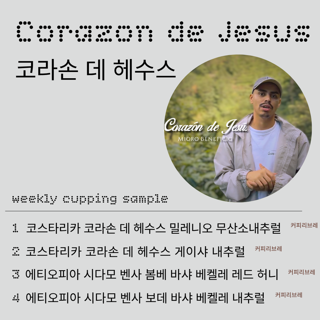 이번 위클리커핑에서 함께 테이스팅 해볼 커피는 코라손 데 헤수스 농장의 밀레니오와 게이샤입니다.
