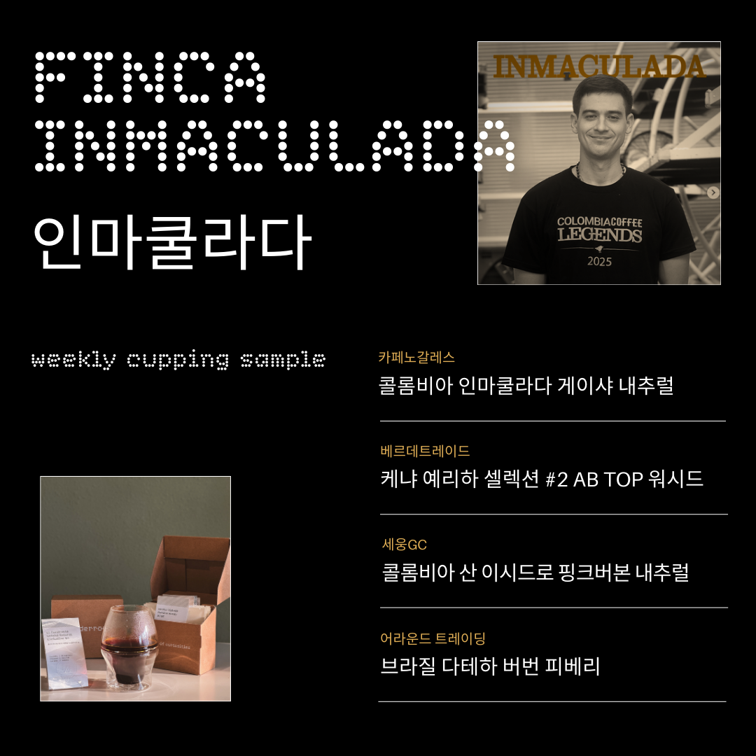 이번 위클리 커핑은 인마쿨라다 농장의 시그니처 내추럴 게이샤가 준비되었습니다.